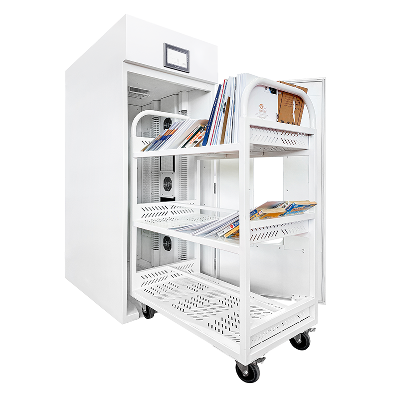 推车式图书档案消毒柜内置除尘装置,能有效去除图书档案上的灰尘并吸附到过滤网上。净化仓内环境、增强消毒效果。其容量大且推车结构使用方便.将要消毒的图书档案放置在推车上,推入消毒仓进行消毒。消毒完成后,将推车推到相应的位置并将消毒了的图书档案上架。